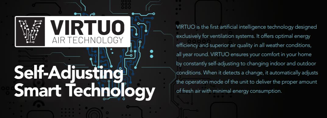 The intelligence of VIRTUO has been designed, programmed and tested to harness the full potential of the state-of-the-art components built into every AI-series device. It relies on the fine speed adjustment capabilities of the motors to adjust the ventilation with the highest precision. Dynamic data analysis ensures a smooth interaction between sensors and motors.